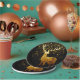 Beautiful and festive holiday paper party plates with polygon geometric golden deer with gold star & snow background on black background