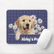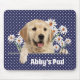 Cute golden retriever with white daisies on blue and white polka dot pattern.