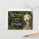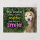 This postcard features a photograph of a smiling golden retriever dog who is peering out from behind a green bush. The quote reads: "The world always looks brighter from behind a smile."