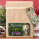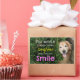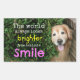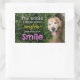 These stickers feature a photograph of a smiling golden retriever dog who is peering out from behind a green bush. The quote reads: "The world always looks brighter from behind a smile."