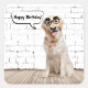 Golden retriever wearing a funny face mask on brick and wood floor.