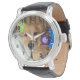 This watch features a photograph of a cute golden retriever dog tucked into bed, while wearing pyjamas and a party hat and holding his teddy bear.  Minutes appear in black, but these can easily be deleted if you prefer.  Available in a variety of styles and colours. Just use the style and colour buttons to the right of the design to view!