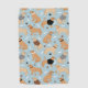 Cute Golden Retriever dogs with dark and light coats sit and stand with scattered dog bones and pawprints on a blue background.