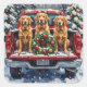 Bring happy, loving charm to your holiday season with this adorable Golden Retriever Christmas design! This festive scene features three friendly, golden-coated Golden Retrievers sitting contentedly in the back of a classic red pickup truck, nestled in a picturesque snowy winter forest. The vintage truck is adorned with a vibrant Christmas wreath, twinkling with red and gold ornaments and warm, glowing lights. Soft snowflakes gently fall, enhancing the winter wonderland effect. A decorated Christmas tree in the background completes this heartwarming picture, making it an ideal Christmas gift for any Golden Retriever owner, dog lover, or admirer of festive and beloved dog art. This design perfectly captures the joyful spirit of the holidays.
