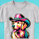 Wrangle up some style with this pop art-inspired design featuring a golden retriever sporting a classic cowgirl hat. Whether you’re a dog lover, a rodeo enthusiast, or someone who appreciates a quirky twist on Western fashion, this design is the perfect blend of playful and chic.The bold lines and vibrant colours give it that unmistakable comic book flair. And that cowgirl hat? It’s the ultimate nod to Texan charm. Wear it proudly to line dancing nights, country fairs, or coffee runs—because every day is a wild ride when you’re rocking this shirt. Spread the cowgirl vibes wherever you go. Don’t forget the lasso—because you’re about to rope in compliments left and right. So grab your hat, hug your pup, and embrace the golden cowgirl spirit.