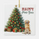 On the front of this Holiday ornament is the image of a beautiful Golden Retriever Dog sitting beside a decorated Christmas tree with gift packages. The red and green text at the side says "MERRY CHRISTMAS". The back of the ornament has the same image, but the text says "HAPPY NEW YEAR". The text may be customised so something else, if you'd like.