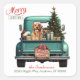 On this sticker, a beautiful Golden Retriever dog looks out from the tailgate of a teal retro style pickup truck. Also in the truck is a decorated Holiday tree, brightly wrapped gift packages, and a red and white Santa Claus hat. The red and teal text says "MERRY CHRISTMAS", with your name and address in red and matching green at the bottom. Be sure to see the matching Christmas products in our store, along with many other dog and cat designs.