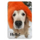 This magnet features a photograph of a cute golden retriever dog who is wearing a big, fuzzy, orange hat while outside in the snow. Customisable text says, "Hello!"