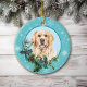 On the front of this Holiday ornament is a beautiful portrait of a Golden Retriever dog peeking out of a holly and evergreen bough. Red berries and pine cones decorate the holly and pine sprigs. The image is placed on a pale blue circle framed by a retro blue snowflake pattern. The back of the ornament has the same background and circle with your custom text in blue.