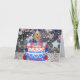 This Independence Day card features a golden retriever wearing a hat of candles popping out of a 4th of July cake that says Happy Birthday America on it. The text reads, “Hope your Fourth of July really takes the cake!”.