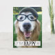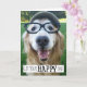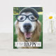 It's a happy day! This card features a photograph of a smiling golden retriever dog who's wearing a hat and glasses. Text on front reads, "Get Your Happy On!" while inside customisable text states, "Hope you have a great day!"