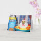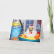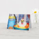 This greeting card features a golden retriever dressed as a chicken in a bowl of chicken soup with the can of soup beside him.