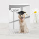 Blonde golden retriever on wood floor with shadowed background and black graduation cap with gold tassel.