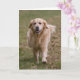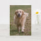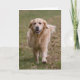 A greeting card featuring a colour photographic image of a happy Golden Retriever dog trotting across the grass.