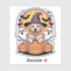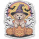 Adorable Halloween illustration featuring a happy golden retriever dog wearing a purple witch hat, surrounded by carved jack-o’-lantern pumpkins, spooky ghosts, flying bats, and a vibrant orange moon background. This playful and festive cartoon-style design perfectly captures the fun spirit of Halloween with a mix of cuteness and spooky charm. Ideal for dog lovers, Halloween art fans, and anyone who enjoys cheerful seasonal illustrations.