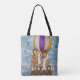 This tote bag features golden retrievers dressed as hot air balloon pilots flying through the sky on their hot air balloon.