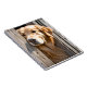 Closeup of a Golden Retriever peeking around an old rustic barn door.