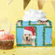Cute golden retriever in snowflakes in green tinsel frame with snowflakes on aqua background.