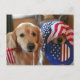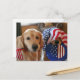 Happy 4th of July! Show your patriotic spirit with this cute golden retriever postcard!  Design features two dogs celebrating Independence Day with red, white, and blue flags, bandanas, and flying discs.