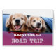 This greeting card features a photograph of two smiling golden retriever dogs with their heads looking out a car window, along with the text, "Keep Calm and Road Trip." Text on inside reads, "Happy Adventures!" but this can be changed or deleted.