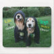 This mouse pad features a photograph of two smiling golden retriever dogs who are wearing sweatshirt hoodies outside. The quote reads, "Life is great! Dogs make it better!"