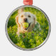 Ceramic ornament with image of a golden retriever with tennis ball in mouth in the shrub.