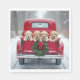 Golden retriever puppies sit in the back of a red truck decorated with a festive Christmas pine wreath and snowflakes.