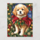 Holiday postcard featuring a cute golden retriever puppy, dressed up in ribbons in a frame of fir branches, ornaments and snowflakes. "Merry Christmas" greeting on back is customisable. Visit my shop for more cute animal art.