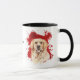 A beautiful water colour portrait of a Golden Retriever stands out against a bright red abstract paint splatter background. The image is on two sides of the mug, with your name or other custom text in black between them.
