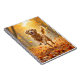 A joyful golden retriever dog runs through an autumn forest surrounded by colourful falling leaves