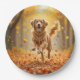 A joyful golden retriever dog runs through an autumn forest surrounded by colourful falling leaves