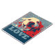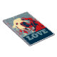 This notebook features a closeup of a smiling golden retriever dog, done in the "hope" stencil style with red, white and blue colours, along with the word love.