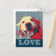 This postcard features a closeup of a smiling golden retriever dog, done in the "hope" stencil style with red, white and blue colours, along with the word love.