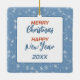A trio of pretty Golden Retriever Dogs looks out from the back of a vintage red pickup truck on this Christmas ornament. The truck is decorated with Holiday evergreen boughs and a red bow. The image is placed on a blue background with white snowflakes falling all around. The back of the ornament has the same blue snowflake border with a centre banner that says "Merry Christmas Happy New Year", and you may customise the year.