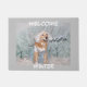 This door mat features a golden retriever dressed as a winter fairy sitting in the snow and holding a wand spelling out Winter. The text reads, “WELCOME WINTER”.