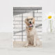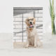 Golden retriever dog with black eyeglasses and chequered bowtie on brick for dad on Father's Day.