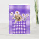Cute blonde golden retriever dog in purple and white gingham pocket with daisies for general birthday.