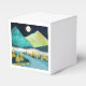 A beautiful landscape with unique textures showing a river and mountain landscape with a rising moon and starry sky in shades of blue, gold, dark green, and yellow.