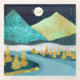 A beautiful landscape with unique textures showing a river and mountain landscape with a rising moon and starry sky in shades of blue, gold, dark green, and yellow.