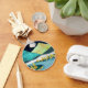 A beautiful landscape with unique textures showing a river and mountain landscape with a rising moon and starry sky in shades of blue, gold, dark green, and yellow.