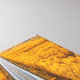 A long, straight road cutting through a vast expanse of golden autumn forest. The road appears to vanish into the misty distance, creating a sense of mystery and intrigue. The vibrant yellow foliage of the trees contrasts beautifully with the grey sky, adding to the overall dramatic effect. A single car travels along the road, emphasizing the vastness of the landscape and the solitude of the journey.