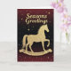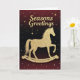 Celebrate the season with this charming holiday card featuring a glittering golden rocking horse set against a rich red-to-black gradient background sprinkled with stars. The elegant “Season’s Greetings” message adds warmth and sophistication, making this card ideal for sending festive cheer to loved ones of all ages.