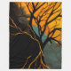 This evocative abstract artwork explores the deep connection between growth, grounding, and transformation through the powerful symbolism of a tree at twilight. Stark black branches stretch upward against a glowing sky of warm amber and soft teal, while luminous golden roots flow downward into darkness, creating a striking visual balance between light and shadow. The composition feels both dramatic and meditative, inviting reflection on where we come from and what sustains us.