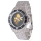 Has heft and feel of expensive stainless steel quartz watches. Good band with safety catch. I removed links, which is easy because engraved arrows show direction to push the linking pins. As always by this seller, the image (a railroad logo) is a perfect reproduction of my emailed image, and is precisely spaced and aligned.
