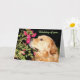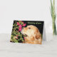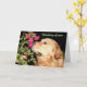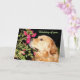 This golden retriever is sniffing beautiful pink roses and sending the message that you're thinking of someone and sending them your love.