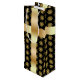 An elegant wine bag with a black background and a gold coloured snowflake pattern. The front and back of the bag have a gold coloured ribbon. On the front there's a white bow.
