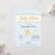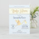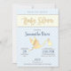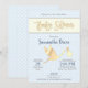 Featuring golden colour Baby Shower Calligraphy script and a golden colour baby carrying stork with white polka dots and a gentle blue background.