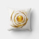 A square pillow featuring a golden sun shaped piece of art art with abstract swirls around it.