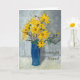 A pretty Birthday Card with 'Happy Birthday' in Welsh and a blue vase of Golden Yellow Sunflowers, from an oil pastel painting by Judy Adamson.