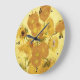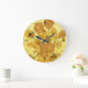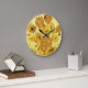 A wall clock with the fine art post-impressionist painting, Sunflowers (1888), by Vincent Van Gogh (1853-1890). Fifteen flowers in a vase against a golden background.